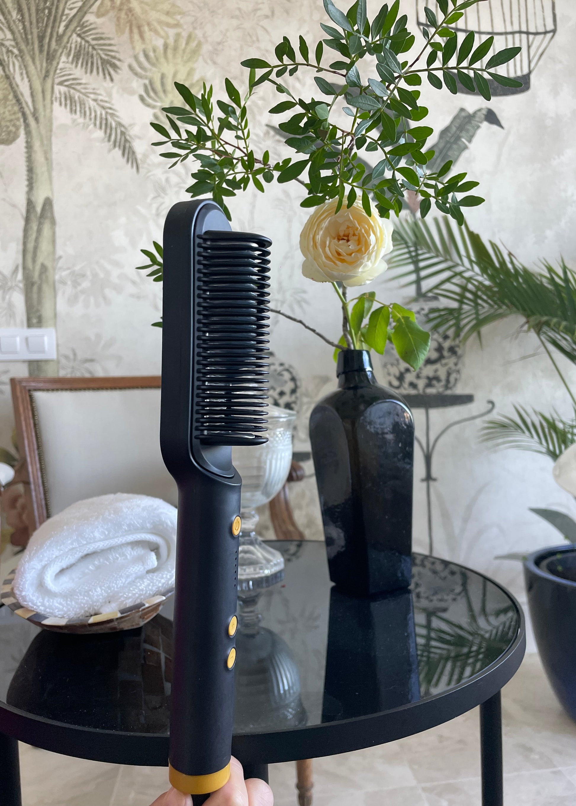 Cepillo plancha para alisar y planchar el cabello. ESPECIFICACIONES: -Color: Negro con bordes dorados. -4 Niveles de temperatura fáciles de regular, de entre 130-200ºC -Cable giratorio 360º -45W de potencia